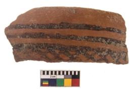 | Description / विवरण | Specimen of black on red ware with black decorative Horizontal lines and lattice design geometric painting. |