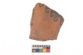| Description / विवरण | Specimen of black on red ware with black decorative Small arch like design and suspended loop with a circle on the right geometric painting. |