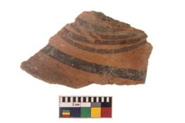 | Description / विवरण | Specimen of black on red ware with black decorative Curved lines geometric painting. |
