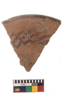 | Description / विवरण | Specimen of black on red ware with black decorative Diamond lattice geometric painting. |