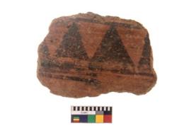 | Description / विवरण | Specimen of black on red ware with black decorative Group of vertical triamgles geometric painting. |
