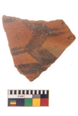 | Description / विवरण | Specimen of black on red ware with black decorative Curved lines geometric painting. |
