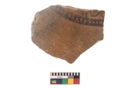 | Description / विवरण | Specimen of black on red ware with black decorative Vertical lines in between curved lines geometric painting. |