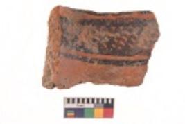 | Description / विवरण | Specimen of black on red ware with black decorative Lattice design geometric painting. |