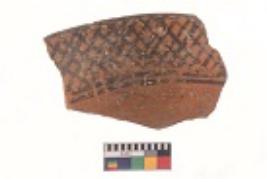 | Description / विवरण | Specimen of black on red ware with black decorative Lattice design geometric painting. |