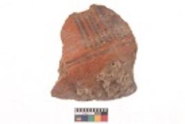 | Description / विवरण | Specimen of black on red ware with black decorative Parallel horizontal lines intersecting vertical lines geometric painting. |