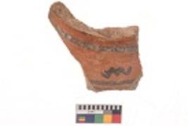 | Description / विवरण | Specimen of black on red ware with black decorative Curved lines and wave like design geometric painting. |