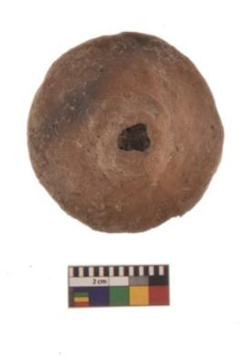 | Description / विवरण | Specimen of terracotta Wheel. It is red ware rounded shape with center perforation. |