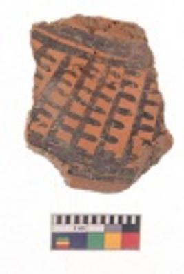 | Description / विवरण | Specimen of black on red ware with black decorative Vertical lines intersecting horizontal lines and row of arcs with short vertical strokes geometric painting. |