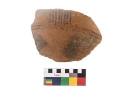 | Description / विवरण | Specimen of black on red ware with black decorative Vertical lines geometric painting. |