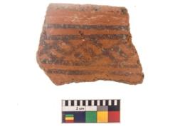 | Description / विवरण | Specimen of black on red ware with black decorative Lattice design geometric painting. |