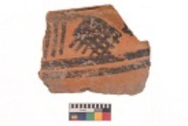 | Description / विवरण | Specimen of black on red ware with black decorative Octahedron like lattice design and vertical lines geometric painting. |