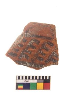 | Description / विवरण | Specimen of black on red ware with black decorative Row of arcs with short vertical strokes geometric painting. |