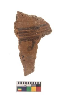 | Description / विवरण | Specimen of black on red ware with black decorative Horizontal lines and suspended loop with circle on the left geometric painting. |