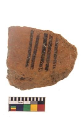 | Description / विवरण | Specimen of black on red ware with black decorative Parallel vertical lines geometric painting. |