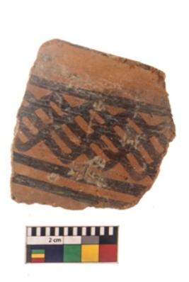 | Description / विवरण | Specimen of black on red ware with black decorative Lattice design geometric painting. |