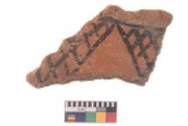 | Description / विवरण | Specimen of black on red ware with black decorative Lattice pattern geometric painting. |