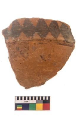 | Description / विवरण | Specimen of black on red ware with black decorative Broad double axe like design geometric painting. |