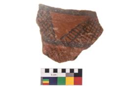 | Description / विवरण | Specimen of black on red ware with black decorative Lattice design geometric painting. |