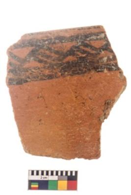 | Description / विवरण | Specimen of black on red ware with black decorative Lattice design geometric painting. |