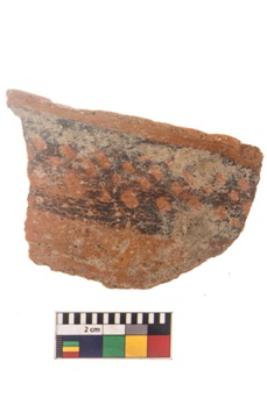 | Description / विवरण | Specimen of black on red ware with black decorative Circles between lines geometric painting. |