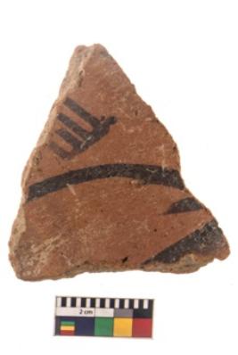 | Description / विवरण | Specimen of black on red ware with black decorative Lattice and curves geometric painting. |