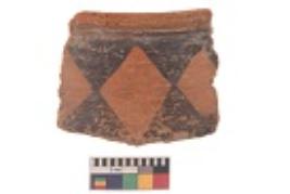 | Description / विवरण | Specimen of black on red ware with black decorative Double axe like design and horizontal lines geometric painting. |