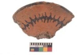 | Description / विवरण | Specimen of black on red ware with black decorative Curved lines and row of arcs with short vertical strokes geometric painting. |