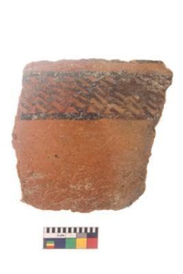 | Description / विवरण | Specimen of black on red ware with black decorative Lattice pattern geometric painting. |