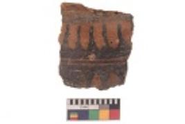 | Description / विवरण | Specimen of black on red ware with black decorative Parallel horizontal lines intersecting vertical lines and elongated thick lines geometric painting. |