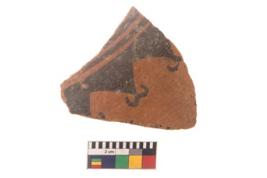 | Description / विवरण | Specimen of black on red ware with black decorative Triangles with W shaped design geometric painting. |