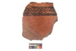 | Description / विवरण | Specimen of black on red ware with black decorative Lattice pattern geometric painting. |