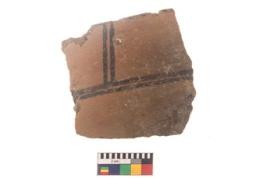 | Description / विवरण | Specimen of black on red ware with black decorative Vertical lines intersecting horizontal lines geometric painting. |