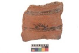 | Description / विवरण | Specimen of black on red ware with black decorative Horizontal lines and half sun design geometric and nature painting. |