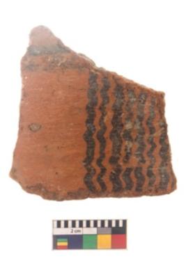 | Description / विवरण | Specimen of black on red ware with black decorative Wavy design geometric painting. |
