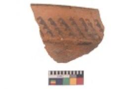 | Description / विवरण | Specimen of black on red ware with black decorative Small vertical lines and horizontal lines and row of arcs with vertical strokes geometric painting. |