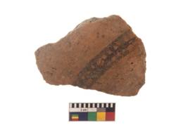 | Description / विवरण | Specimen of black on red ware with black decorative Lattice design geometric painting. |