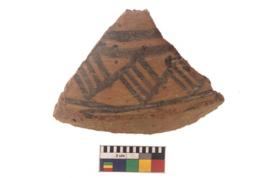 | Description / विवरण | Specimen of black on red ware with black decorative Lattice design geometric painting. |