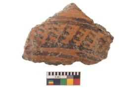 | Description / विवरण | Specimen of black on red ware with black decorative Row of arcs with short vertical strokes geometric painting. |