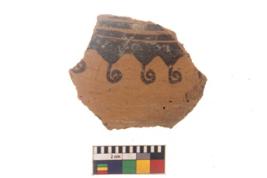 | Description / विवरण | Specimen of black on red ware with black decorative Arch like design and suspended loop with circle on the right geometric painting. |