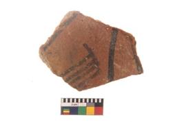 | Description / विवरण | Specimen of black on red ware with black decorative Feather like design geometric painting. |
