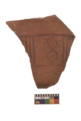 | Description / विवरण | Specimen of Potsherd black on red painted pottery. It is fine fabric in sharp contrast with painted design are executed in black pigment. |
