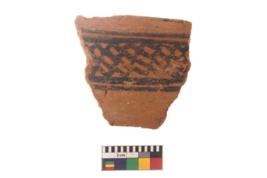 | Description / विवरण | Specimen of black on red ware with black decorative Lattice pattern geometric painting. |