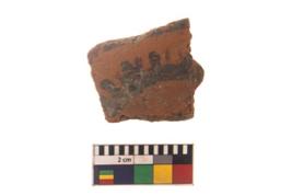 | Description / विवरण | Specimen of black on red ware with black decorative Broad line with vertical strokes geometric painting. |