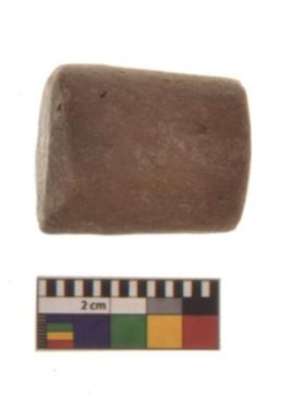 | Description / विवरण | A partially broken specimen of a terracotta gamesman with truncated ends. The base of this object is flat and flares slightly more than the apex. |