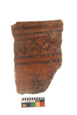 | Description / विवरण | Specimen of black on red ware with black decorative Parallel wavy lines geometric painting. |