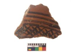 | Description / विवरण | Specimen of black on red ware with black decorative Lattice design geometric painting. |