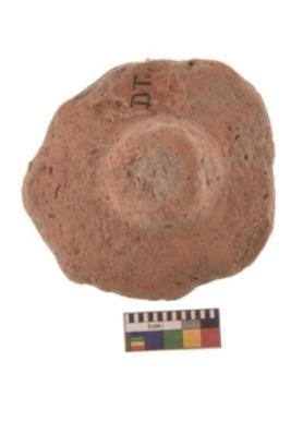 | Description / विवरण | Specimen of terracotta wheel with broken edges and scratch marks on one side near perforation. |