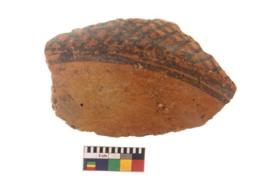 | Description / विवरण | Specimen of black on red ware with black decorative Lattice design geometric painting. |