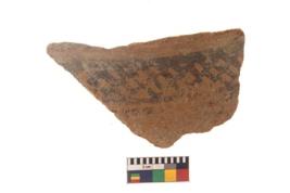 | Description / विवरण | Specimen of black on red ware with black decorative Lattice design geometric painting. |